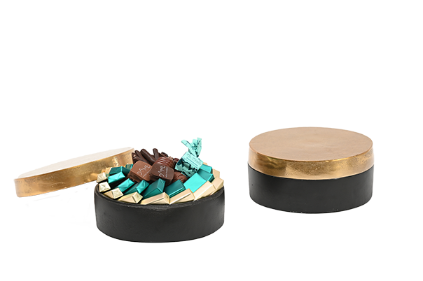 Boîte ronde en aluminium noir et doré garnie de chocolat